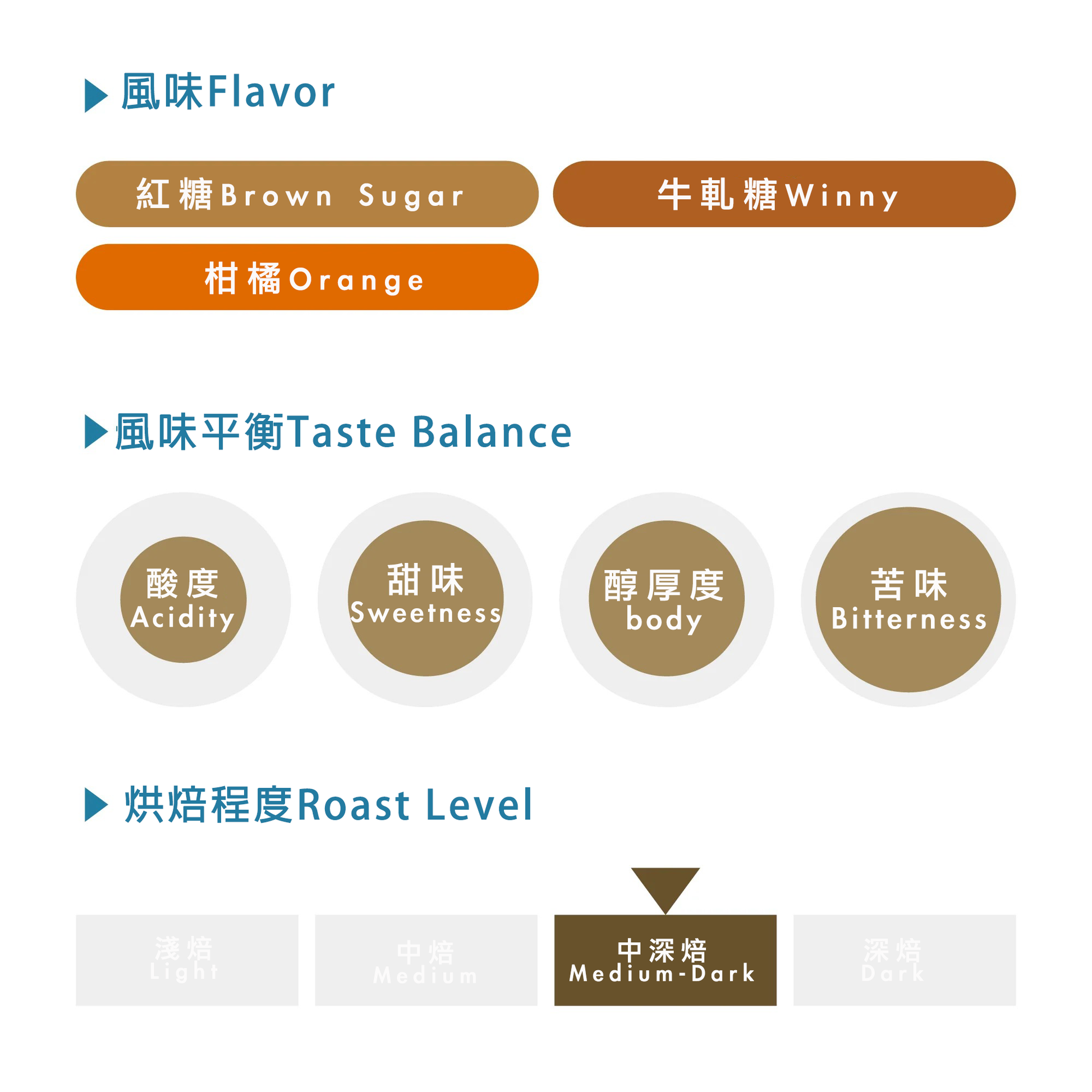 透過中深焙度的烘焙曲線,整體風味被如同黑糖般濃郁而厚實的甜感所包覆。杯中帶有讓人聯想到牛軋糖的柔和堅果風味,並疊加淡淡的橙子香氣,為甜感增添一抹輕盈的果香層次。酸質溫和且圓潤不尖銳,口感滑順且飽滿。甜感、果香與醇厚度之間取得良好的平衡,是一杯風味穩定且結構和諧的咖啡。